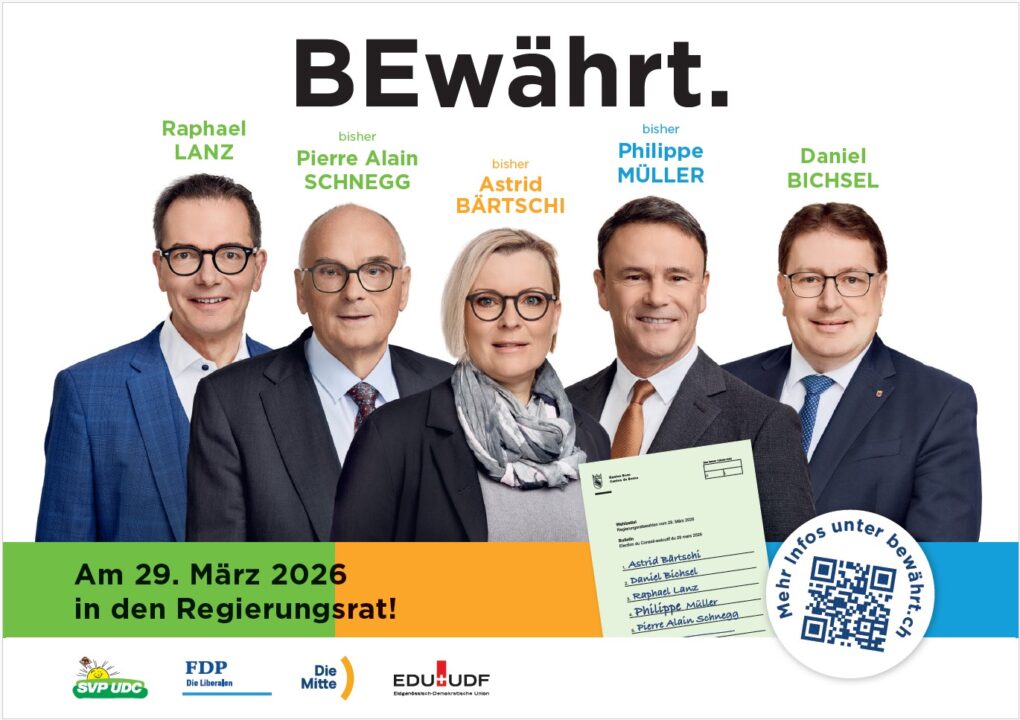 2. Schreibt nur die Namen des bürgerlichen Fünfertickets auf den leeren amtlichen Regierungsratswahlzettel, mindestens aber die Namen Pierre Alain Schnegg, Daniel Bichsel und Raphael Lanz!